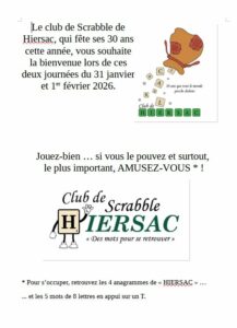 Frédéric, le seul à scrabbler sur ROUSTIRA, mène la danse à – 26, avec une quarantaine de points d’avance sur Jean et Franck, séparés de 3 points. Les SN2 Claude-Annie et François sont une trentaine de points derrière nous. Et ensuite, ça a explosé de partout mais les Hiersacaises sont groupées car Catherine est 15ème, Christine est 18ème, Claudine est 21ème et Maryfrance … n’est pas 24ème mais 34ème 🙂 ! Allez, au bar, certaines du bon côté … donc pour aider 😉 !