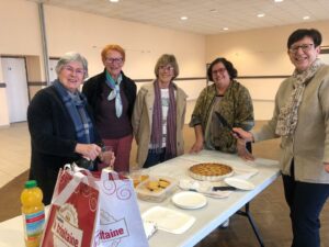 Je l’ai déjà évoqué : Catherine avait prévu de nous régaler avec sa pâtisserie (tarte aux pêches de son jardin et cookies aux pépites de chocolat) ce que nous n’avons pas manqué de faire à la fin de la partie. Nous avons donc trinqué avec plaisir en l’honneur de ses ??? ans, comme le prouvent la photo prise par notre présidente.