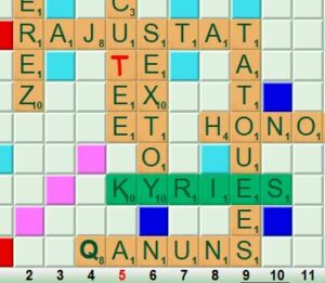 Il y avait, aussi, DETATOUE, seul autre scrabble, pour 3 points de moins. Le coup 4 est joli et je suis fier … de mes ouailles, qui ont pratiquement tous joué SEXTO (mot, encore, invariable), en collante. Cécile ne perdra que 9 points avec le sous-top FOREZ, formant, au passage, RAJUSTAT. Le coup 5 permet à Cécile d’occuper, provisoirement, la seconde place, derrière le boss (au top). Avec le Q et le U, on pense à former -QU- mais QUAND (trouvé par Denise) perd une trentaine de points sur QANUNS (= CANOUNS, KANOUNS, QANOUNS). Hélas, les super-pouvoirs de Forgywoman ne font plus effet au coup suivant puisqu’elle loupera HONORERA (seul scrabble), qui gagnait 24 points sur … REAJUSTAT. Au coup 7, DEFEREZ ne sera raté que par Christine, qui perdra 13 points avec DEFERREZ. A-t-elle raté la place R-AJUSTAT ou a-t-elle assuré, peu sûre de l’existence de R-AJUSTAT ? Au coup suivant, Cécile et Denise perdent 2 points sur le top, en étant BIGAME (c’est leur choix …). Il fallait jouer VIBRAGE (action de soumettre à des vibrations), en s’appuyant sur le bon R d’HONORERA, n’est-ce pas Christine ? Au coup 10, Franck voit rapidement ENVOUTER pour 61 points mais se désole que le binôme ENTREVU–VENTRUE ne passe pas. Après une recherche active sur les places plausibles, il dégote le top, SURVENTE (du verbe défectif SURVENTER …) qui gagne 4 points sur ENVOUTER, en se disant que quelques joueuses allaient prendre une bulle, ultérieurement, avec SURVENTES. Sur ce coup, on pouvait limiter la casse avec RE-DEFEREZ (- 21) voire VETURE (- 29) mais c’était la panique car les CCCD n’ont pas marqué plus de 26 points, avec une petite VERRUE. Le coup 11 est fatal à bibi, encore au top. Vous prenez « NKROSIY » et vous avez 2min30 pour trouver 98 points ! Alors, soyons méthodiques … Si on s’intéresse au K, pas mieux que 36 points avec KIR formant K-ET. Rappelons que je pensais que SURVENTE ne pouvait pas être prolongé par un S ! J’avoue ne pas avoir vu KSI, pour 50 points, avec le S, au bout de VIBRAGE. Avec le Y seul, on peut penser aux pivots formant AY : NAY formant AY avec le A d’HONORERA culmine à 45 points. Passons à l’association -KY- : YORKS (sur le R d’HONORERA) ou KYRIE (sur le E de SURVENTE) est battu de 3 points par KYRIES (nouveau pluriel), le Y formant … SEXTOY. Franck, en extase devant sa trouvaille (cf grille ci-dessous) s’est contenté des 49 points des KYRIES.
