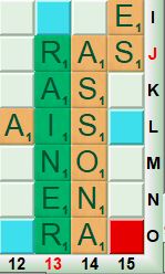 t fatal à Christine (qui était 3ème à 19 points de Catherine) et à Cécile, qui connaît un début d’année difficile : DECUMES (scrabble unique) gagne 58 points sur ECIMES ! Au coup 12, Forgywoman montre qu’elle a des raisons d’espérer, en trouvant un superbe ABORNE (délimiter un terrain par des bornes), le A formant ALIGNE. Ca gagne 1 point sur RAINER (duo de Christine et Claudine), en collante intégrale le long d’ASSONA, joli !